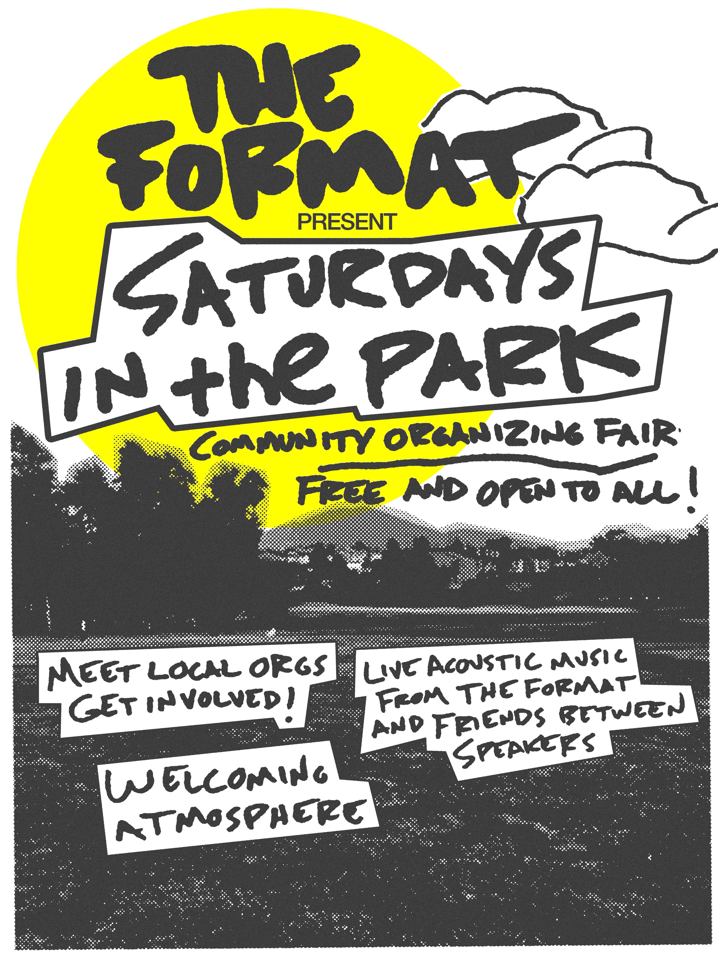 Join The Format at Saturdays In The Park to hear music and learn about local organizations doing important work in your community. Make buttons, connect with other fans, and enjoy acoustic performances from The Format and some of their musical friends. Saturdays In The Park events are free, all ages, and will run during the afternoon.